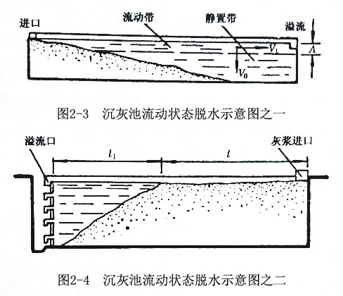 灰水流動(dòng)狀態(tài)的脫水是灰水由沉灰池的一端進(jìn)入,澄清水由另一端溢流排出的連續(xù)作業(yè),灰粒在灰水流中邊流動(dòng)邊沉降。在沉灰池中灰水分為兩帶,上層灰水流動(dòng)部分稱為流動(dòng)帶,下層靜止沉降積灰部分稱為靜置帶(圖2-3和圖2-4)。沉灰池中粗、重顆粒,由于水力沉速快,穿過運(yùn)動(dòng)帶的時(shí)間很短,被灰水流攜帶向溢流口移動(dòng)的距離也很短,故在沉灰池進(jìn)口處快速沉降,而形成一個(gè)坡向溢流口的斜面?;宜粩嘁M(jìn),澄清水溢流,斜面積灰層逐漸增高,待溢流水中含灰量超過允許限度(<0.1)時(shí)就關(guān)閉灰水進(jìn)口閘門,再靜置一段時(shí)間后,入出澄清水就可以挖灰使用。