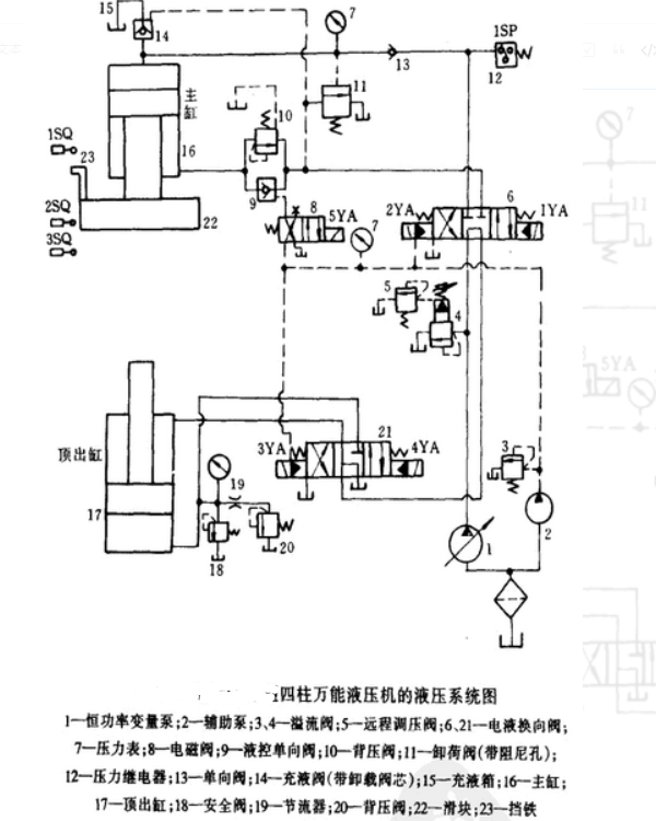5、最后主缸停止時(shí)的狀態(tài) ,當(dāng)主缸滑塊上的鐵23按下沖程開(kāi)關(guān)1SQ時(shí),電磁鐵2YA被切斷,主缸活塞被位于M功能中心的閥門(mén)6鎖定,停止運(yùn)動(dòng),返回行程結(jié)束。此時(shí),泵1油通過(guò)閥門(mén)6,閥門(mén)21返回油箱,泵處于卸載狀態(tài)。在實(shí)際使用中,主汽缸可以在任何時(shí)候停下來(lái)。